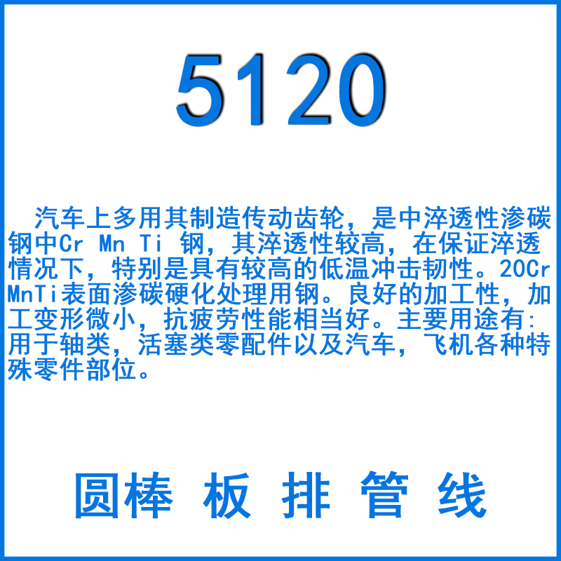 5120是滲碳鋼,滲碳鋼通常為含碳量為0.17%-0.24%的低碳鋼。汽車上多用其制造傳動齒輪,是中淬透性滲碳鋼中Cr Mn Ti 鋼,其淬透性較高,在保證淬透情況下,特別是具有較高的低溫沖擊韌性。5120表面滲碳硬化處理用鋼。良好的加工性,加工變形微小,抗疲勞性能相當好。主要用途有:用于軸類,活塞類零配件以及汽車,飛機各種特殊零件部位。