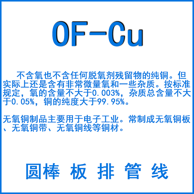 0F-CU無氧銅是不含氧也不含任何脫氧劑殘留物的純銅。但實際上還是含有非常微量氧和一些雜質(zhì)。按標(biāo)準(zhǔn)規(guī)定,氧的含量不大于0.003%,雜質(zhì)總含量不大于0.05%,銅的純度大于99.95%。根據(jù)含氧量和雜質(zhì)含量,無氧銅又分為一號和二號無氧銅。一號無氧銅純度達(dá)到99.97%,氧含量不大于0.003%,雜質(zhì)總含量不大于0.03%;二號無氧銅純度達(dá)到99.95%,氧含量不大于0.003%,雜質(zhì)總含量不大于0.05%。