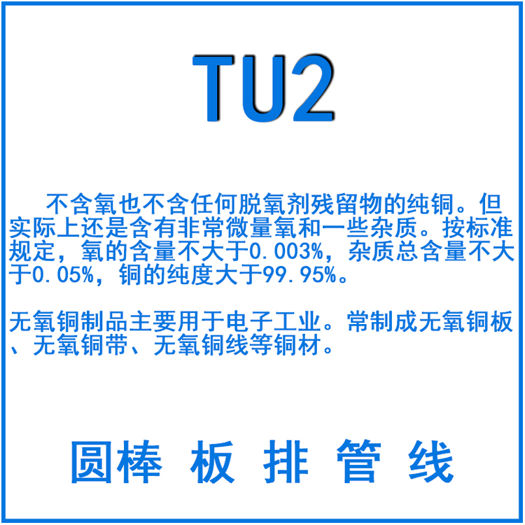 1、TU1無氧銅的純度達(dá)到99.99%,氧含量不大于0.001%;TU2無氧銅的純度達(dá)到99.95%,氧含量不大于0.002%。